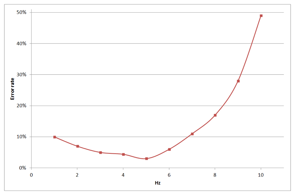 The first tests sought to find the optimum blinking frequency of the dynamic AR marker, to maximize data throughput for an acceptable error rate. This frequency was estimated to lie in the interval between 3 and 6 Hz, as shown in Figure 16. Inside this range, the best frequency was ∼5 Hz.