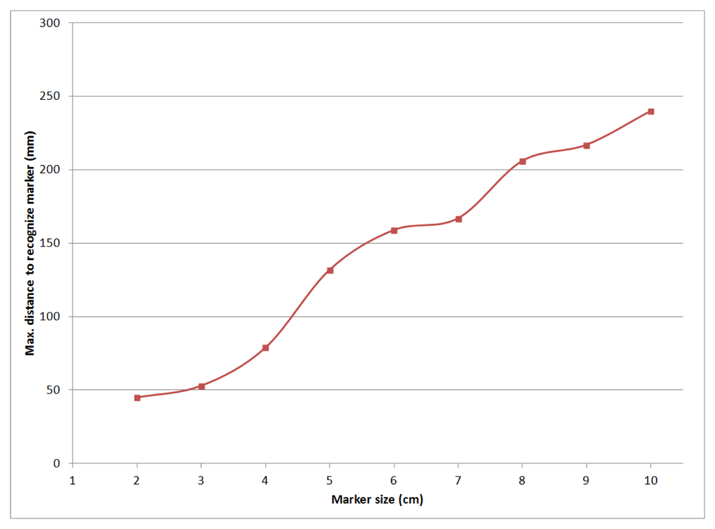 Another relevant performance evaluation target was the maximum detection distance, to assess the usability of the system proposed against other technologies that cannot attain both high directionality and relatively long ranges, such as NFC, RFID, WiFi and Bluetooth. This distance is directly proportional to the actual size of the marker. Figure 17 shows the maximum detection distances for our mobile device, for dynamic marker sizes between 2 cm and 10 cm. Smaller sizes would be unfeasible, as the resulting distances would not be valid for AR applications. Nevertheless, bigger sizes would be indeed feasible and even desirable, if longer detection distances are necessary. For example, it would be possible to arrange the marker LEDs around the electrical panel. The prototype presented in this paper used a 6 × 6 cm marker yielding a maximum interaction distance of about 160 cm.