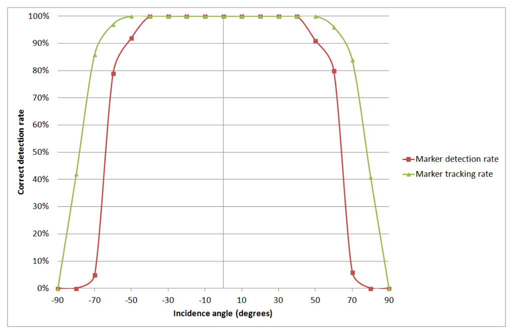 We also evaluated the effect of the device camera incidence angle in the detection rate of the dynamic marker. We tested this both for detection and tracking. Figure 18 shows the results. They suggest robust detection is feasible for angles between −50 and 50 degrees, which is perfectly adequate for the purposes of the system. By adding tracking to the recognition, this range widened to (−60, 60).