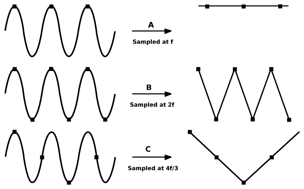 According to this symbol coding scheme, the information transmission data rate for a given frequency F1 is F1/2 bytes per second (half a byte every 1/F1 seconds). Since most modern smartphones and video conferencing cameras are capable of shooting video at 30 frames per second [26] (i.e., the sampling frequency is Fs = 30Hz) and taking into account the sampling theorem, the maximum LED blinking frequency that can be correctly detected is Fb = Fs/2 = 15Hz. As shown in Figure 2, at least two samples (images) must be captured each blinking period in order to correctly detect the LED frequency of reference.