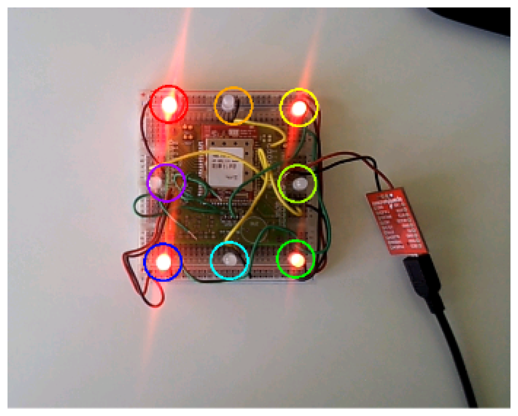 Because of its geometric simplicity, a beacon consisting of a square array of eight LEDs was selected for a proof-of-concept implementation. The function of the LEDs in the corners of the array is to define the area to be analyzed, which is used as a reference to determine the position and orientation of the beacon. The LED in the upper left corner always remains on as a reference point to find the other three vertices and, hence, the transmitting LEDs. The remaining LEDs on the vertices (upper right, lower left and lower right) blink at a fixed frequency (F1), as a clock reference for synchronizing the sampling of the data LEDs. The four remaining LEDs, positioned halfway between the reference LEDs, are used to transmit information (data LEDs).