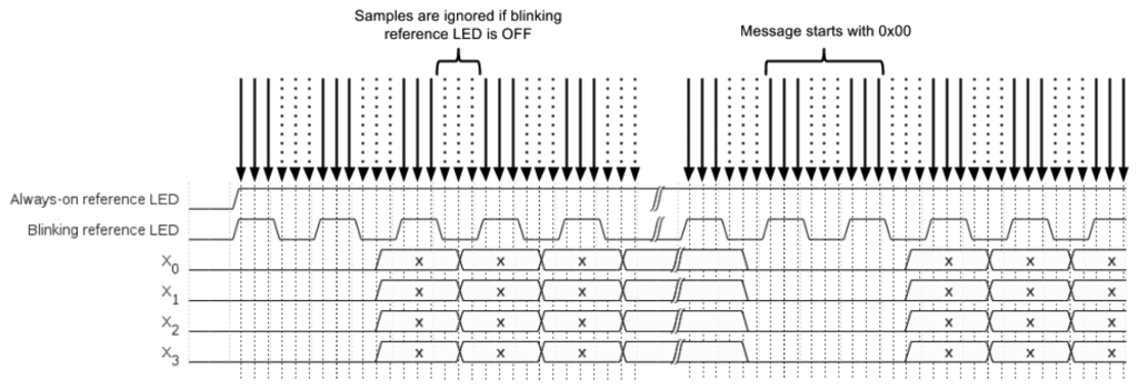 Care must be taken when reading the values of each Xi so that the smartphone camera does not sample the status of a changing LED (ON to OFF or OFF to ON), since this could lead to errors in the decoded message. To prevent this from happening, the blinking reference LEDs are used as a clock source, so that data LEDs only change their values when the blinking reference LEDs are OFF. Furthermore, the value of each Xi is only assumed to be valid if the blinking reference LEDs for the frame being processed are all ON.