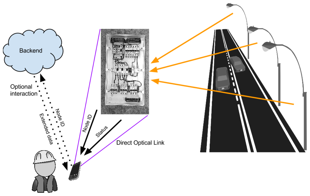 When the maintenance worker changes the view from general to detailed information, the incoming information is fed to the terminal in a different way. Whilst general data are mainly received through optical (VLC) means, detailed information is retrieved by querying the cloud with the corresponding node ID.