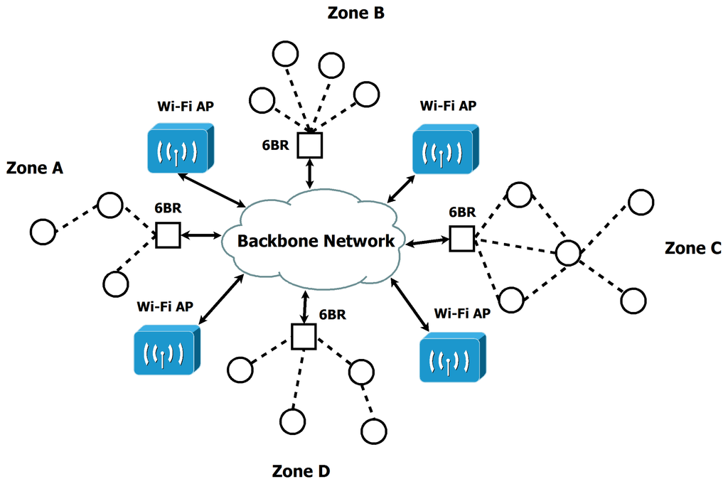The BRs located in each of the defined mesh zones are responsible for routing information from their respective mesh networks to the backbone and for ensuring adaptation between the 6LoWPAN protocol and the standard IPv6 protocol. They maintain route tables for their networks and are also in charge of 6LoWPAN header compression and decompression for messages sent through their interfaces between the 6LoWPAN network and the backbone.