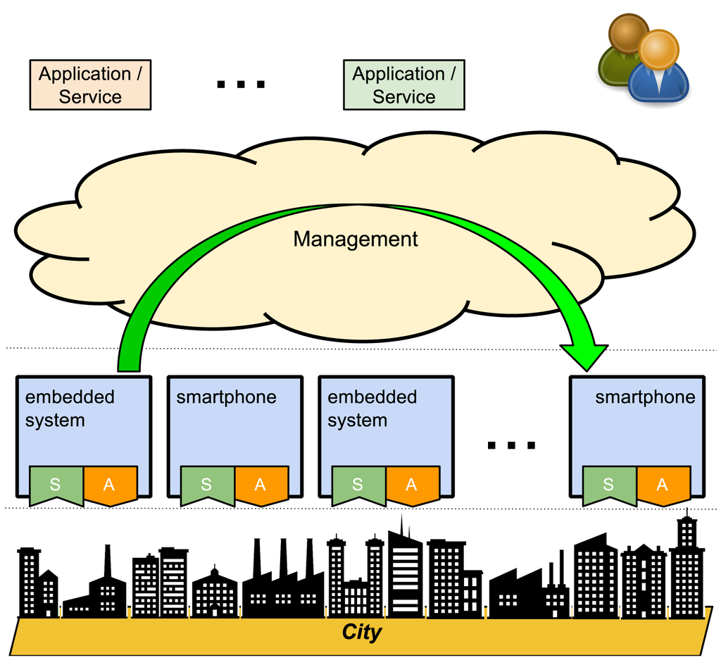 The smart city scenario is one of the most prominent scenarios for IoT involving computer-assisted treatment of sensed data and automation of urban areas and public facilities. Smart cities are usually characterized by field-deployed, dispersed, sensor-hosting smart platforms, usually available in several orders of magnitude greater quantities, possibly heterogeneous along several axes (instruction set architecture, operating system, user space, runtime, etc.). What makes a city smart is, apart from green and environment-friendly technologies, at least sensing and communication facilities, also embracing mobility, to enhance public transportation systems and monitor physical infrastructure (buildings, open spaces, etc.). When actuating subsystems enter the picture, the city as a whole may be compared to a nervous system, where reactive mechanisms are in place, either mediated centrally or even working autonomously. Indeed, as shown in Figure 1, a middleware devoted to management of both sensor- and actuator-hosting resources may help in the establishment of higher level services, including policies for “closing the loop”, such as configuring triggers for a range of (dispersed) actuators based on sensing activities from (geographically non-overlapping) sensing resources.