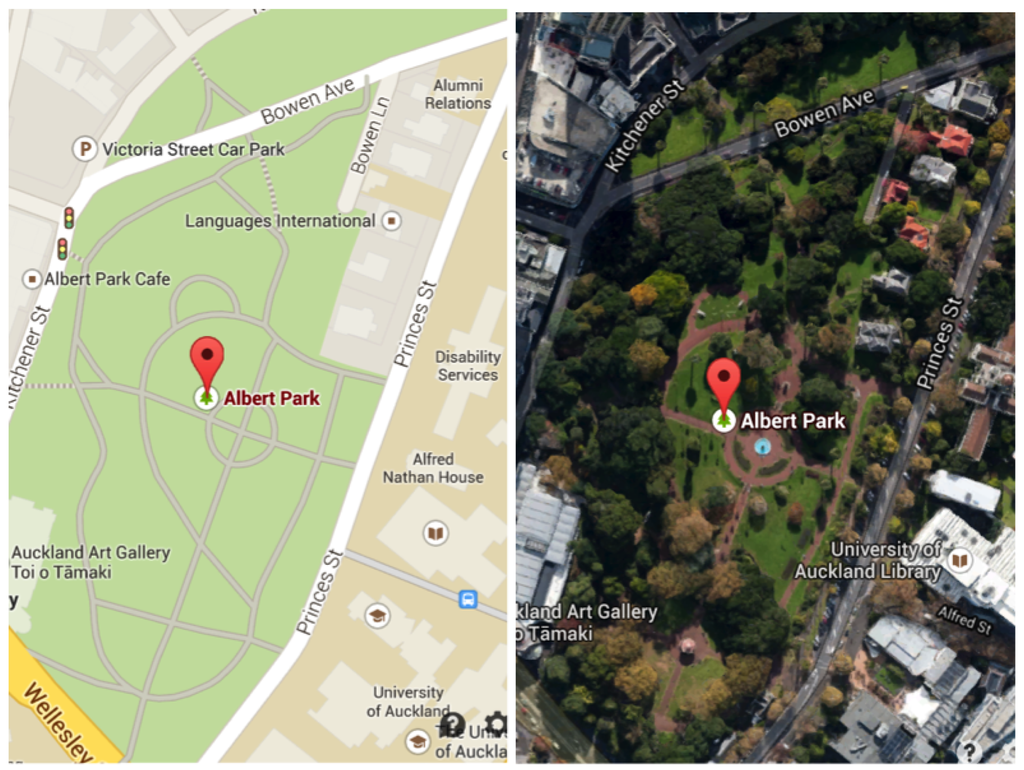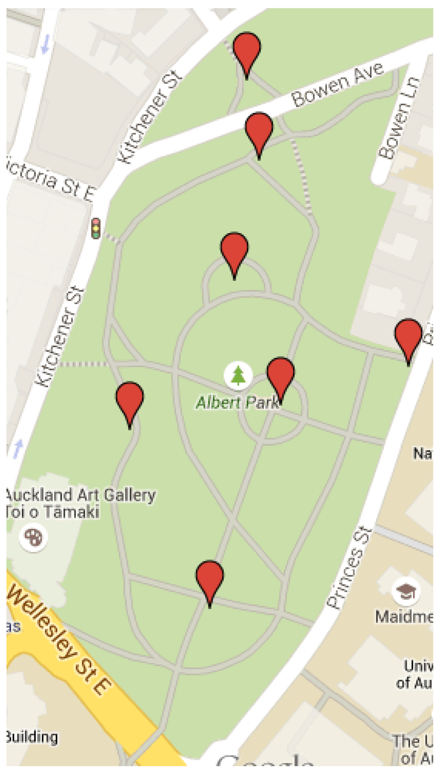 Monitoring of shared spaces, like a public green park, a zoo or a shopping mall, may provide a significant number of ancillary services. These include, but are not limited to, collecting information on functional performance, public security and safety-related data, infrastructure and maintenance requirements, public interest in remotely exploring the space, just to name a few. Lampposts in outdoor shared spaces may be considered as suitable receptacles belonging to the public areas that could host the infrastructure for certain monitoring systems. These are usually available in all kinds of public shared spaces in modern cities. In addition to access to lighting and related energy management, these may also provide access to energy sources and, thus, possibly leverage power line-based communication over the smart grid. If we take Albert Park as an example, at the heart of Auckland City in New Zealand (see Figure 2), we have an instance of a park serving, apart from residents from neighbouring areas, a big community belonging to two universities (more than 50,000 people). These are adjacent to the park, from both the east and south sides. The park is well organized, populated with plants, pedestrian and bicycle tracks, lampposts and other facilities. It provides a short cut for the people of the two universities to reach the city centre and main transport stations, like bus, train and ferry terminals.