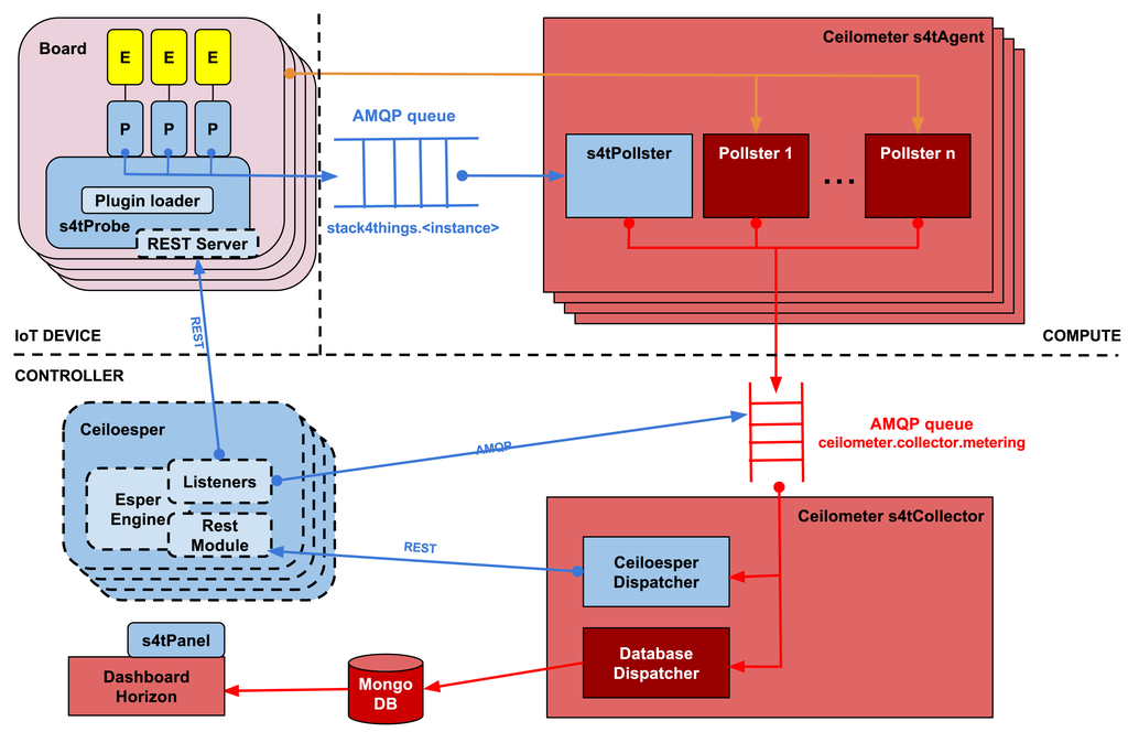 A probe (s4tProbe), to be hosted in an active instance of a runtime, has been implemented in Python, based on the stevedore library for enabling and loading a monitoring plugin. There is such a plugin for each runtime environment (depicted as E), such as Node.js or Python, available on the sensor board, in our case an MPU-equipped Linux-hosting Arduino embedded system, the Arduino YUN model. The same tools and approach are employed to load other OpenStack modules, such as the pollster, the dispatcher, etc., in particular with regard to the Ceilometer, in turn made up of an agent and a controller. More in detail, an abstract class (PluginBase) has been designed for the implementation of new plugins and is to be enabled by the aforementioned library for plugins.
