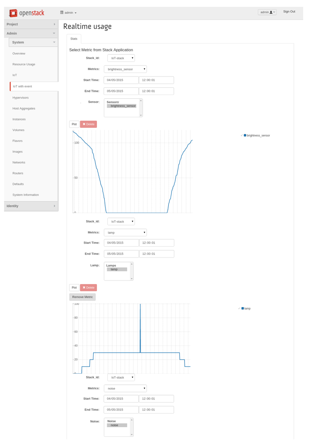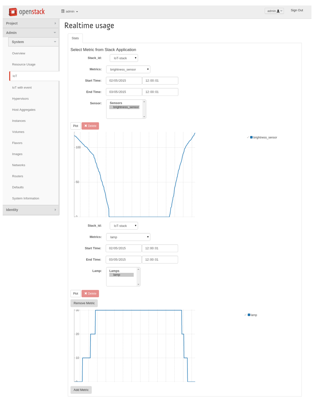 Apart from web UI-based administration tasks, the OpenStack Dashboard, codenamed Horizon, is employed also for data visualization duties. In order to add a real-time graph and a Google Maps-powered sensors geolocation system to Horizon, an IoT-enabled panel, the s4tPanel, has been implemented, included inside the “admin” project label group and labelled “IoT”. The latter requires dropping in a predefined directory (/usr/share/openstack-dashboard/openstack_dashboard/ dashboards/admin) in a folder (iot) that contains all of the essential files, such as: