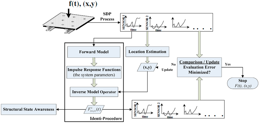 This paper presents a systematical impact inspection and structural condition monitoring scheme. By using the distributed sensors networks defined, an advanced real-time IVI technique is proposed to estimate the impact locations and force histories including the information about the force magnitudes and to visualize the structural state when impacts occurred. In the automatic identification procedure, a precise forward model for a given structure can be established rapidly through the functional module of forward model generator. Meanwhile, by incorporating with the dynamic state-space model, the impact forces can be reconstructed from a small number of impulse response functions from the optimal parameters () of the model structure calculated using the proposed fast GA parameter estimation during forward modeling, where eliminates the need of numerous impact training tests for constructing the network of impulse response functions on a structure. Nevertheless, in the impact positioning and evaluation procedure, the initial impact locations can be estimated using the developed smoothed power distribution method, afterwards on the basis of the results from the initial location estimations, the accurate location coordinates of each impact can be updated further by the proposed time of flight (ToF) based quadrilateral sensor network positioning method. It is worth noting that to achieve a highly reliable and highly robust impact monitoring and identification system adapting into complex and harsh engineering environments, the real-time IVI technique shows satisfactory success in predicting impact locations and estimating force histories for various types of structure configurations and under mutative vibration environment conditions, and its capability of structural state monitoring and real-time assessment is also verified. Through all cases of the impact tests considered, the impact visualization inspection technique shows its potential as an on-board rapid diagnostic tool of accidental impact events that can cause possible damage in an aerospace composite structure.