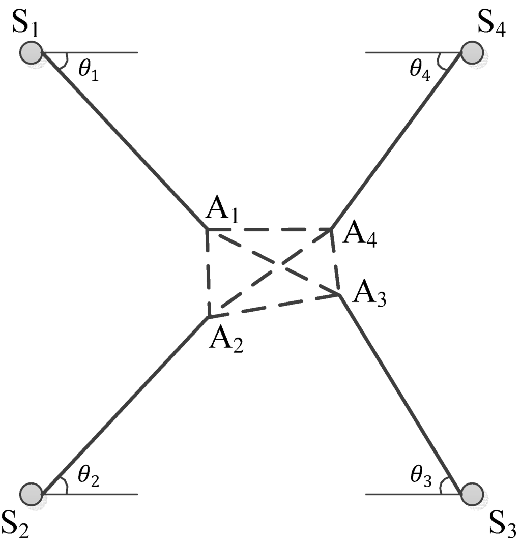 Within an identified impact zone which is composed of four neighboring sensors, using the initially assumed wave propagation angles , the initial distance between unknown impact position and every sensor can be calculated firstly using Equation (13), and four initially estimated impact positions resulting from are also obtained simultaneously. Then a quadrilateral is composed of those positions. To obtain finally the accurate impact coordinates, a procedure of minimizing the area of the dashed quadrilateral must be executed, shown as Figure 6.