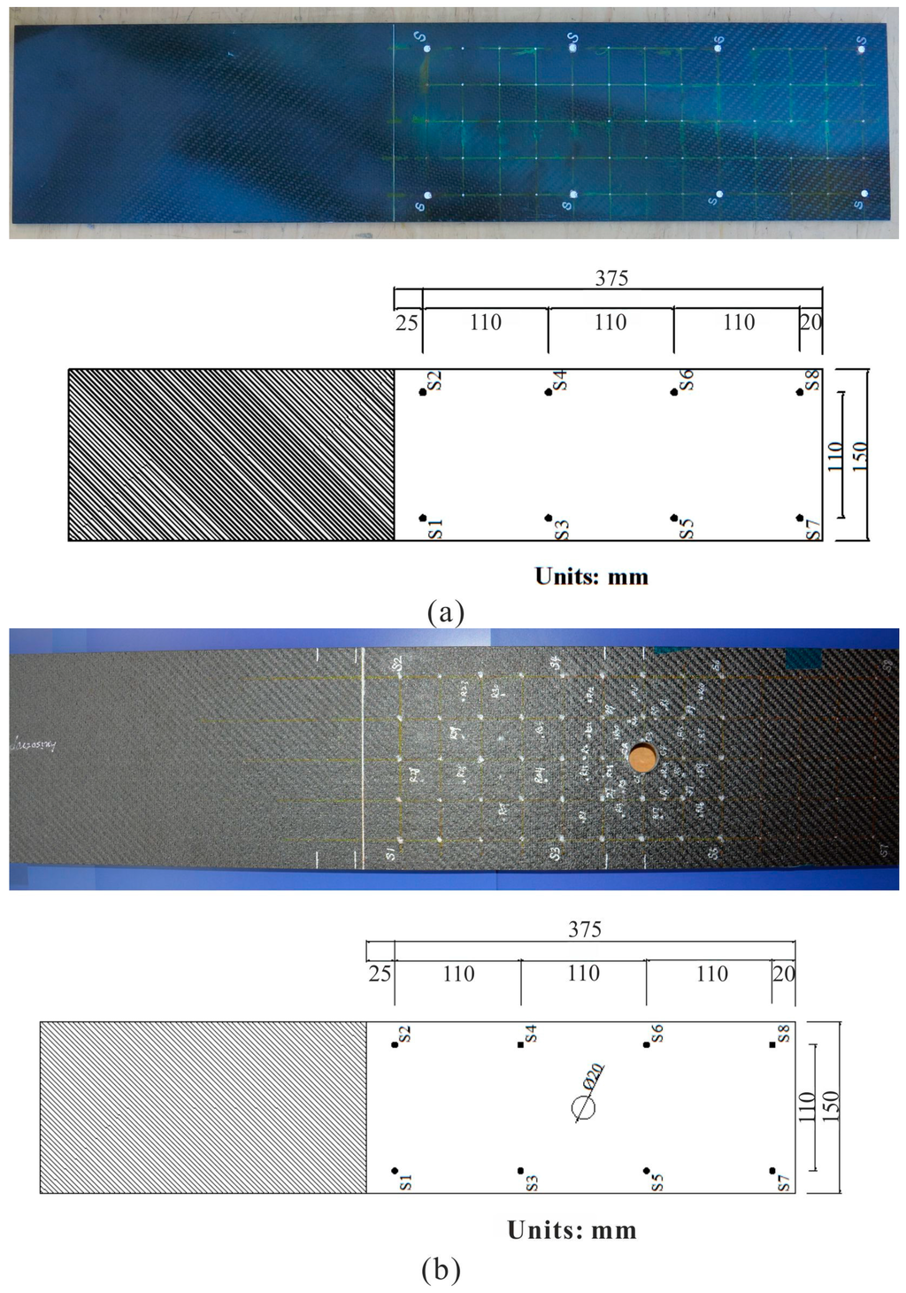 Geometries of the CFRP specimens and their sensor locations. (a) Specimen 1; (b) Specimen 2.