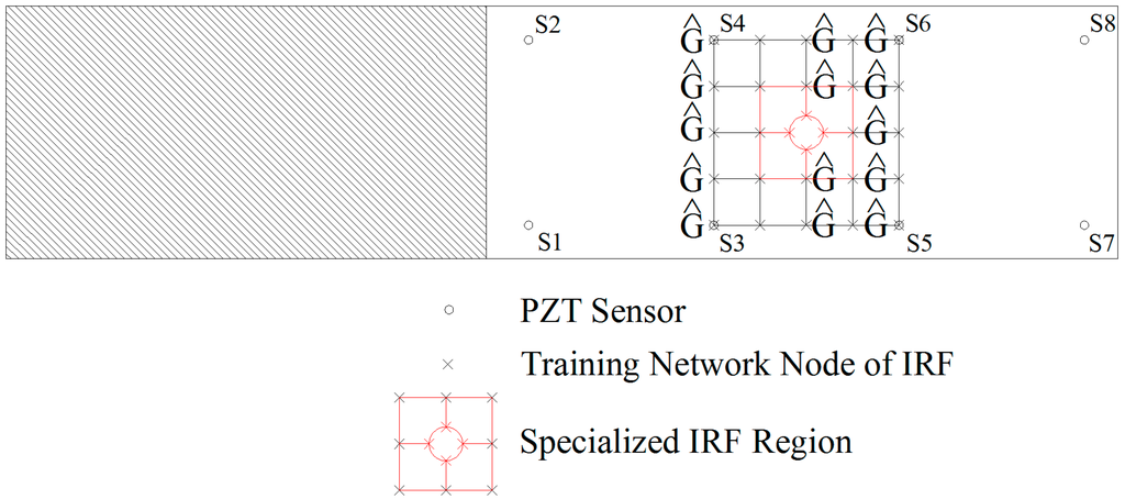 In order to obtain the various IRFs, impact experimental tests were performed on the two specimens. For forming the network nodes of the various IRFs, force signals and sensor signals from the structural responses were recorded, (1) from 65 impact test points on Specimen 1; (2) from 68 impact test points on Specimen 2 (the schematic demonstration is shown in Figure 10), where the experimental impacts were made at evenly spaced locations, and random force magnitude was applied at each location.