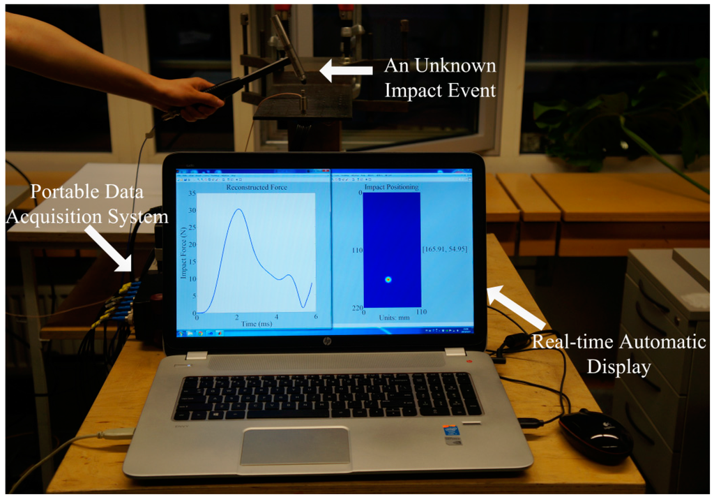Qiu and Yuan [8,9] used a time reversal-based impact positioning method to monitor impact events on complex aircraft wing structures. Nevertheless, a new environmental disturbance factor and mutative structure configurations are proposed in this study, and the novel impact visualization inspection technique is developed to establish more accurate forward and inverse models for monitoring any impact event on structures. The forward model is constructed in terms of impulse response functions (IRFs) on the basis of the relation between input and output, which can be applicable to various structure configurations and can also handle various types of impact objects. Meanwhile, because it provides simple inverse model formulations to identify input forces, thus the entire impact identification procedure become much simpler and faster than the model-based identification technique [10,11,12,13,14,15,16,17]. To interpret the whole impact visualization inspection procedures, they are presented from two major aspects in this paper, which are theoretical development and experimental verification. In the impact visualization inspection technique, a theoretical basis is found using the simulated output data to determine unknown impacts, which are based on the sensor measurements of structural responses. In the subsequent sections describing experimental tests and results and discussion, the developed impact visualization inspection technique is verified and assessed by a series of relevant impact experiments.
