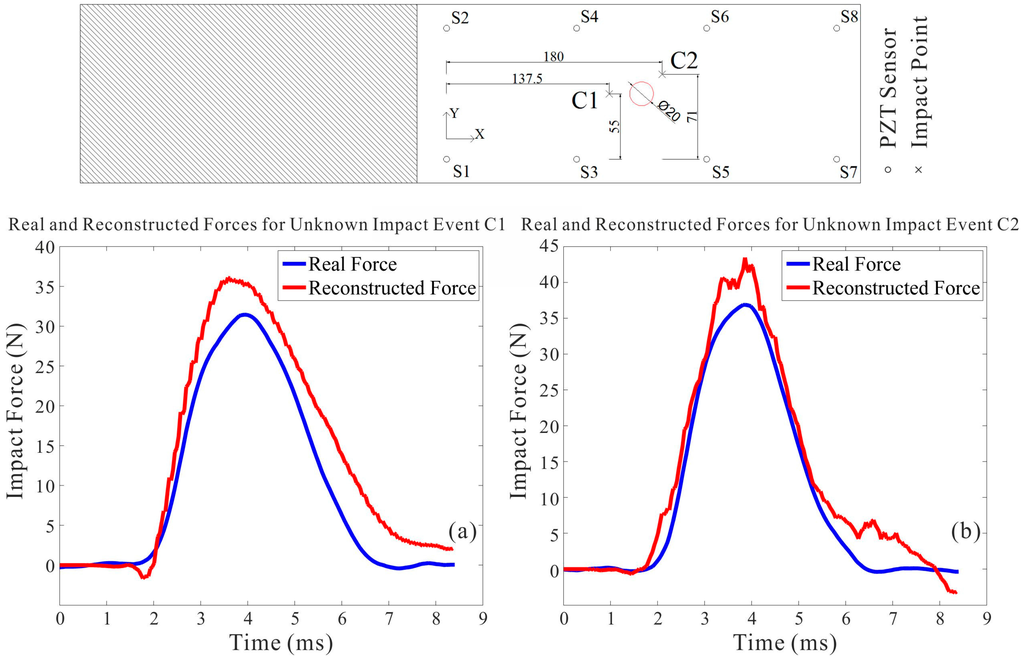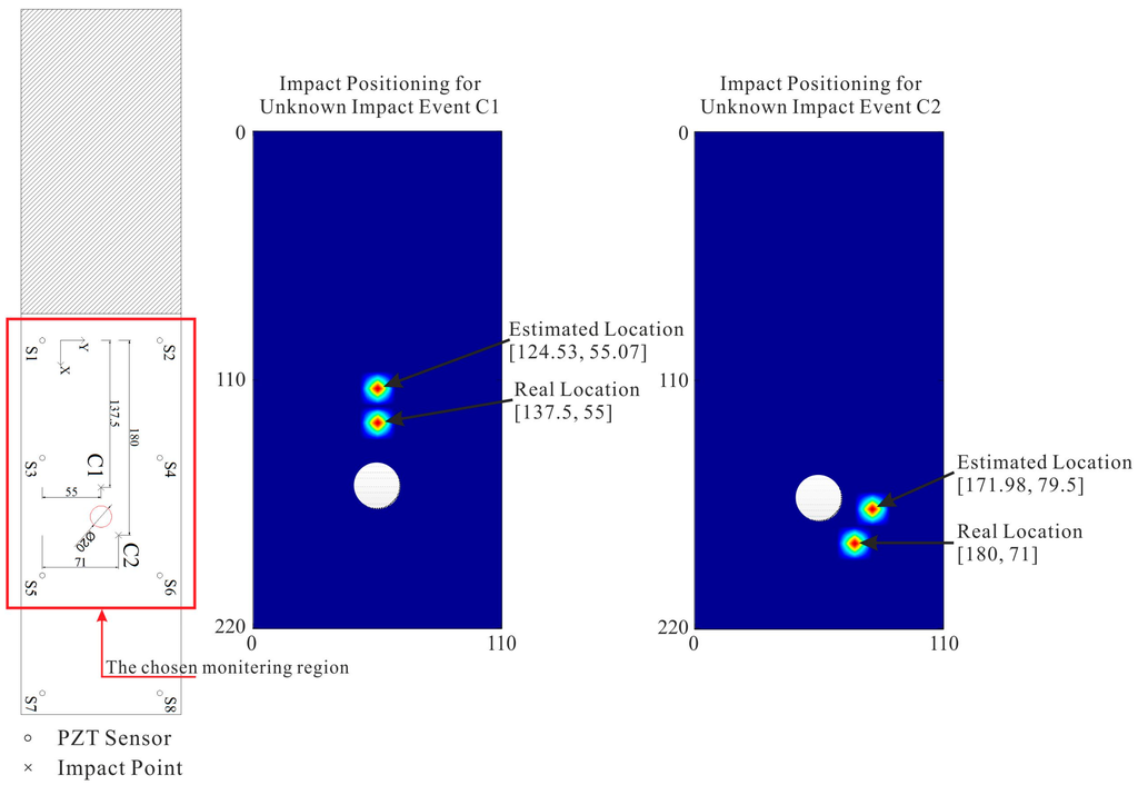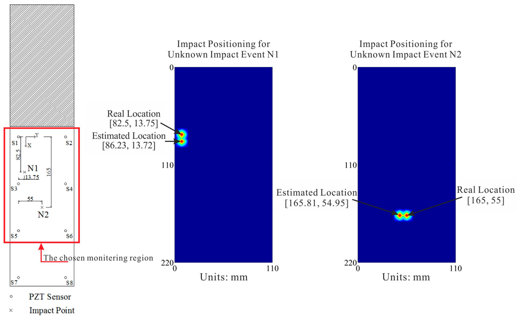 To illustrate the proposed monitoring and identification scheme, Figure 12 presents a set of estimated results for impact locations on Specimen 1, and a set of estimated results for impact locations on Specimen 2 are shown in Figure 13.