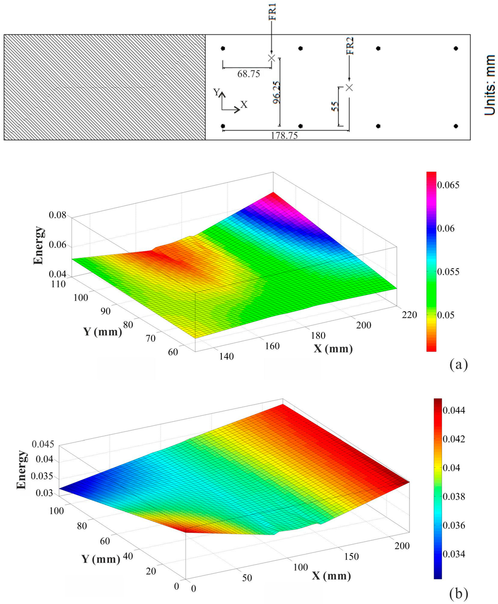 Once impacts occur, the power of each sensor signal can be calculated in a chosen time window using Equation (10). When the power value is calculated at each sensor position in a structure, a smooth power distribution with minimum curvature can be found by the Robust Lowess Smoothing method, and then the smoothed power distribution can be expressed in terms of x and y coordinates, as follows: