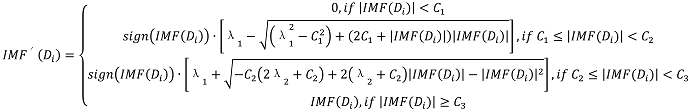 - From the scales with the valuable information, the first five useful scales (such as 1st, 2nd, 3rd, 4th, 5th scales) are extracted normally, and then choose an appropriate threshold at every scale and remove the interfering noises using Equation (1), defined as:where is the threshold which will be determined by a kurtosis-based approach individually for every scale and is given by , Z is the IMF coefficient of a scale, is the kurtosis of the decomposed components, , , and will be specified according to the value in each scale.