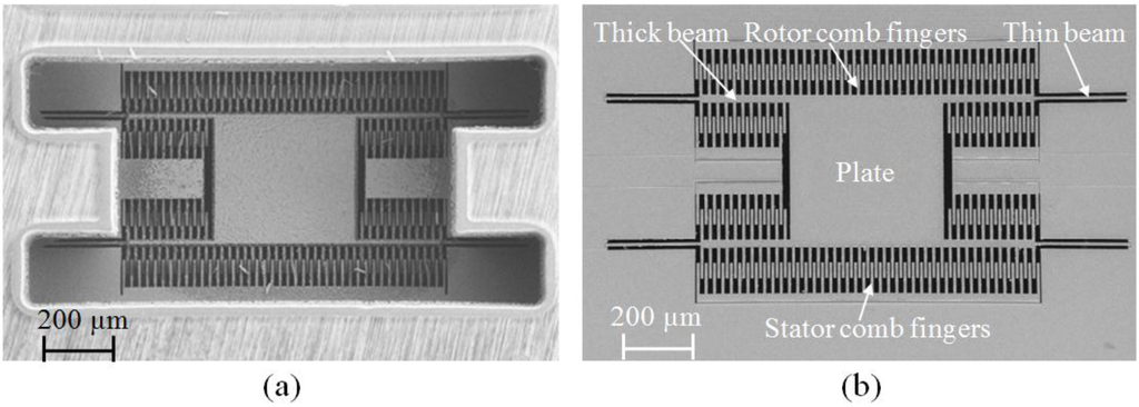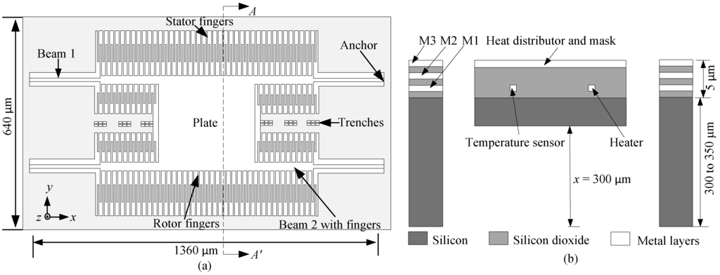 The sensor device is fabricated using standard 0.35 µm CMOS process technology and post-CMOS micromachining through a multiple project wafer (MPW). The CMOS process technology consists of two polysilicon, three metal, several dielectric layers, and two vias. All metal layers are aluminum (Al), whereas silicon dioxide (SiO2) is used as the dielectric layer and tungsten is used for the vias. Figure 1a shows a schematic of the top view of the device and consists of a plate supported by four beams with each beam having two sections of different widths of 7 µm and 19 µm but the same length of 240 µm each. The stator comb-fingers are anchored to the substrate while the rotor comb-fingers are attached to the 400 µm × 400 µm plate and also to the thick 19 µm beam (beam 2). Figure 1b shows a schematic cross-sectional view of the device viewed along AA’ to show the CMOS layers and the single crystal silicon (SCS) substrate.