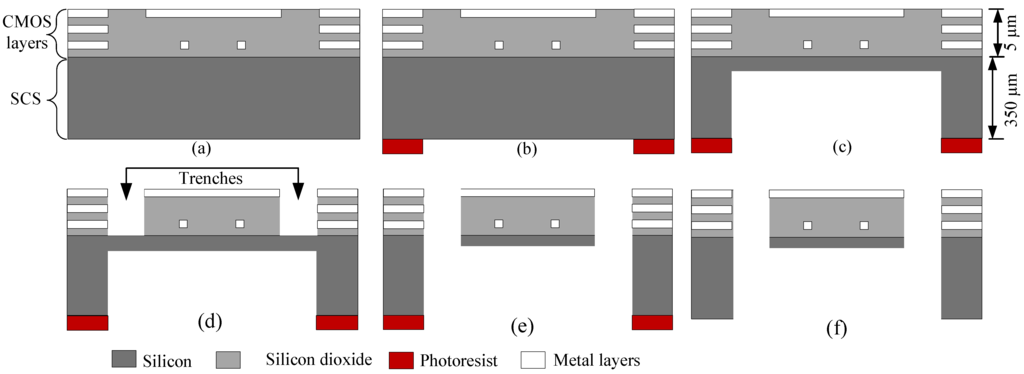After completion of the CMOS process, before the dry etching step, the eight-inch wafer is back-grinded to a thickness of 350 µm from the initial thickness of 750 µm, as shown in the cross section view in Figure 2a. A thick photoresist (PR) layer is then coated on the backside of the eight-inch wafer and patterned as shown in Figure 2b to expose the regions of the sensor devices that need to be exposed while protecting the bonding pads and other regions of the CMOS-MEMS devices that do not need to be released. Anisotropic Deep Reactive Ion Etching (DRIE) is then used to partially etch the SCS substrate from the backside, leaving a layer of 15 µm thick SCS under the CMOS layers to define the MEMS structures as shown in Figure 2c. After SCS etching from backside, the wafer is diced into individual chips and the chips are then mounted on a carrier wafer for front side etching. Figure 2d shows the appearance of trenches after front side etching of SiO2 using Reactive Ion Etching (RIE), while Figure 2e shows a released MEMS structure after using isotropic DRIE to etch through Si from front side. Finally, the photoresist mask is removed to complete the post-CMOS micromachining process as shown in Figure 2f.