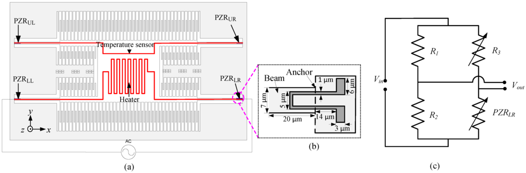 (a) Schematic of electrothermal actuation method and piezoresistive sensing; (b) A magnified view of PZRLR; (c) Wheatstone bridge circuit for measurement of the output signal.