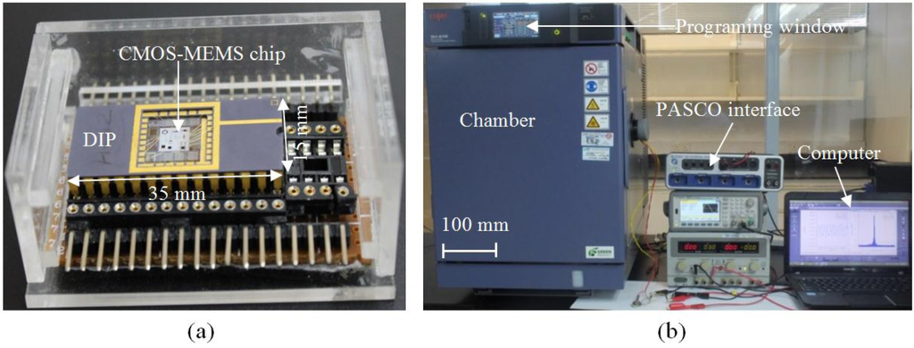 The sensor device that was bonded and packaged in a commercial dual in line package (DIP) as shown in Figure 4a was placed on a sample holder inside a bench-top type SH-242 temperature and humidity chamber of size 300 × 300 × 250 mm, as shown in Figure 4b. For the first experiment, the CMOS-MEMS humidity sensor inside the chamber is operated in the dynamic mode by applying an input AC voltage at frequency of 4 Hz with amplitude of 6 Vpp. The relative humidity inside the chamber is increased and decreased from 35% RH to 95% RH in steps of 5% RH while keeping the ambient temperature constant at 27 °C to observe hysteresis. The time for a 5% RH step increase in humidity is set to 7 min and, in between each step, the humidity is maintained constant for 3 min before increasing it to the next level in another 7 min; the output voltage is measured using PASCO interface card (PS-2124A) connected to a computer, as shown in Figure 4b.