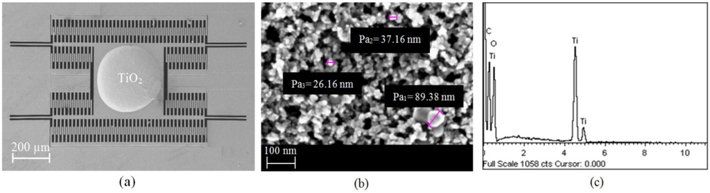 Figure 6a shows an FESEM image of the CMOS-MEMS humidity sensor with nanoparticle-sized TiO2 paste successfully deposited on its plate using a drop-coating method; Figure 6b is a zoomed-in view of an FESEM micrograph on the TiO2 patch on the plate showing the porous distribution of nanoparticles of TiO2; and Figure 6c shows EDX-spectrum of TiO2. The carbon peak observed in the EDX spectrum is from the binder material used to form the paste. The porous structure of TiO2 on the plate increases its surface area and thus is expected to enhance its sensitivity in the adsorption/desorption reaction of H2O on its surface.