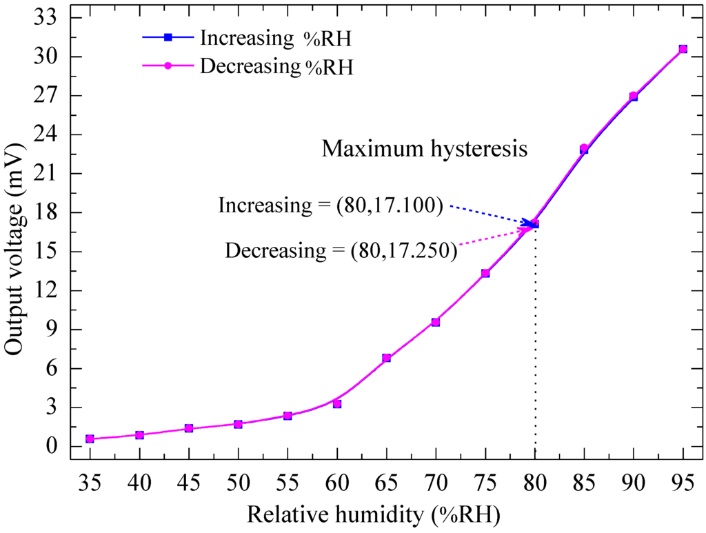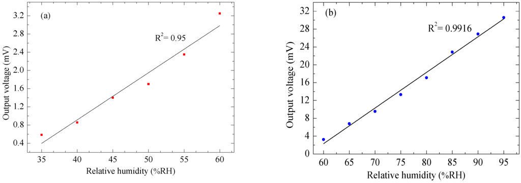 Figure 7 shows the output voltage of the device for increasing and decreasing humidity levels from 35% RH to 95% RH in steps of 5% RH when the device was operated at a frequency of 4 Hz at an applied voltage of 6 Vpp, corresponding to a temperature on the plate of 80 °C. The maximum hysteresis is found to be 0.87% RH at 80% RH, indicating comparatively low hysteresis, which gives the device a high advantage for use in real-time measurements. The output voltage of the humidity sensor increases from 0.585 mV to 30.580 mV as the humidity is increased from 35% RH to 95% RH. It was observed to be linear from 0.585 mV to 3.250 mV as the humidity increases from 35% RH to 60% RH with sensitivity of 0.107 mV/% RH as shown in Figure 8a, and again linear from 3.250 mV to 30.580 mV as the humidity level increases from 60% RH to 95% RH with sensitivity of 0.781 mV/% RH as shown in Figure 8b.