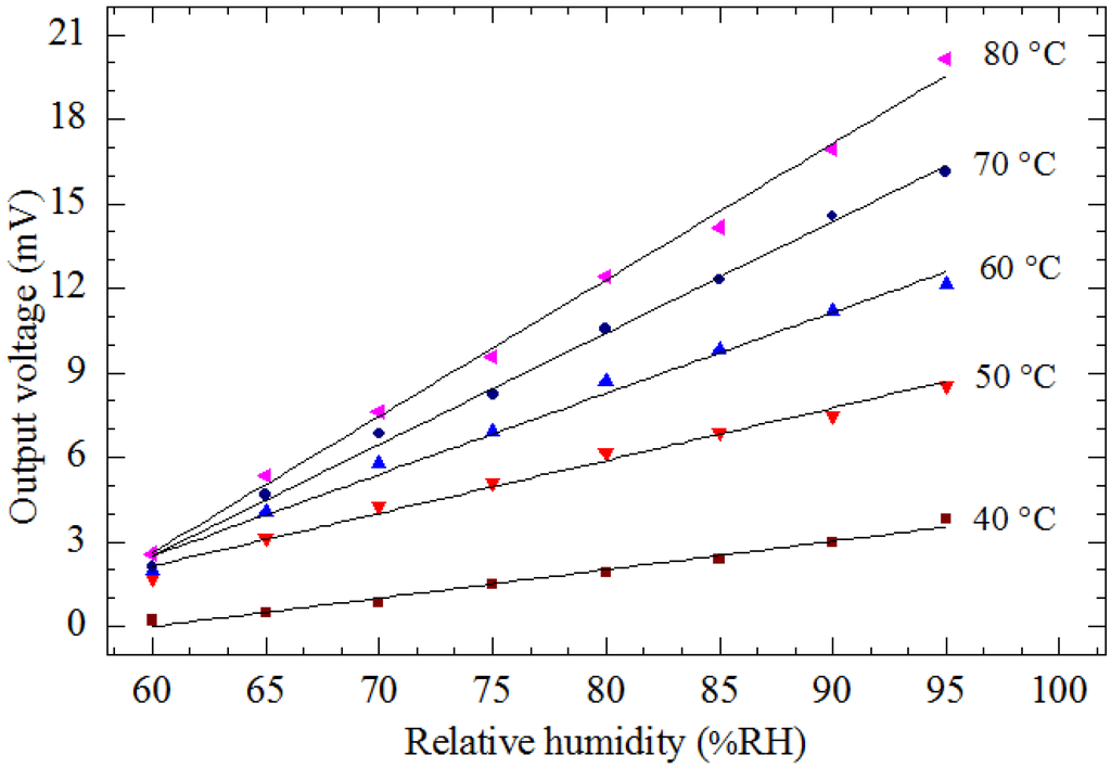 Output voltage vs. relative humidity at an operating temperature of 80 °C, corresponding to applied voltages of 6 Vpp at a frequency of 4 Hz.
