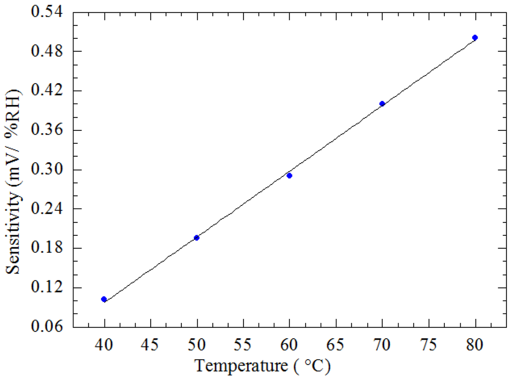 Figure 9 shows the measured results of output voltage of the device as a function of the relative humidity in the linear region from 60% RH to 95% RH when the device was operated at various applied voltages from 2 Vpp to 6 Vpp (corresponding to different operating temperatures from 40 °C to 80 °C) at a constant frequency of 2 Hz. It is observed that the output voltage of the device increases with increasing humidity for different operating temperatures. The slopes of the graph indicate that the sensitivity improves at higher temperatures, as indicated in Figure 10, where the sensitivity is seen to increase linearly from 0.102 mV/% RH to 0.501 mV/% RH with an increase in the temperature from 40 °C to 80 °C. This increase in sensitivity with temperature is expected as desorption of gaseous species such as H2O in humidity detection on the TiO2 surface is enhanced with increase in temperature. At higher temperatures more gaseous species desorb from the sensor surface, resulting in an overall decrease in the mass of the plate and TiO2 and thus an increase in the amplitude of the vibrating structure.