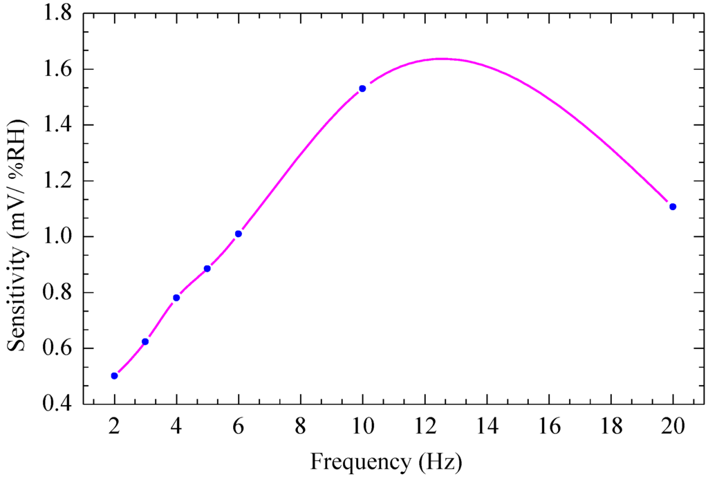 Figure 11 shows the experimental results of sensitivity of the CMOS-MEMS humidity sensor as a function of the applied frequency. The device is operated by applying various frequencies from 2 Hz to 20 Hz with amplitude of 6 Vpp at relative humidity from 60% RH to 95% RH. It is observed that the sensitivity of the device increases from 0.500 mV/% RH to reach a maximum value of 1.634 mV/% RH at a frequency of 12 Hz, then decreases to 1.110 mV/% RH at frequency of 20 Hz. The observed maximum at the frequency of 12 Hz is assumed to be due to the effect of air damping, which increases as the frequency increases. This increase in air damping affects the driving force, which results in decreased amplitude after a certain optimal frequency is reached (about 12 Hz in this case).