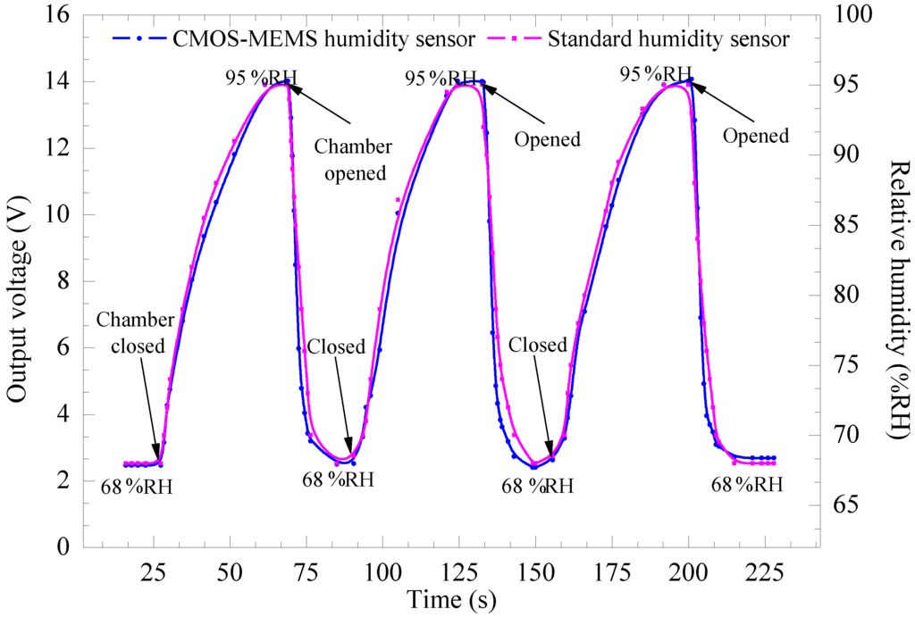 Figure 12 shows experimental results of response, recovery, and repeatability for the device as compared to a standard humidity sensor when the device was operated in the dynamic mode by applying a 2 Hz AC signal with amplitude of 5 Vpp and the relative humidity varied from ambient humidity of 68% RH to 95% RH for three cycles of measurement. It is observed that the output voltage of the CMOS-MEMS humidity sensor follows the standard sensor that directly measures humidity in % RH with a good comparable response, recovery, and stable repeatability.