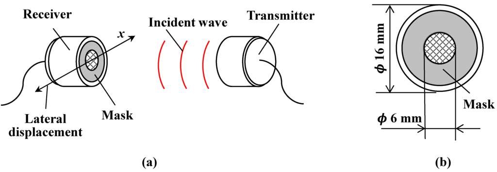 In order to measure the relative lateral displacement over a wide range, the characteristics of the air-coupled ultrasound are utilized. The intensity of the propagating ultrasound waves in the far field follows a Gaussian distribution in a lateral direction [19,20]. Before measuring lateral displacement, the ultrasound intensity distribution of the air-coupled ultrasound transducer must be characterized. Figure 2 shows the experimental setup for measuring the intensity distribution using the relative lateral displacement of a pair of transducers. As shown in Figure 2a, a transmitter and a receiver of air-coupled ultrasound transducers (UT/UR1612MPR, ϕ16 mm in diameter, 40 kHz for central frequency, SPL Limited, Hong Kong) are arranged at a distance of 60 mm and face each other. The installation space is usually very narrow in seismically isolated buildings, it is essential to show capability of measuring lateral displacement over shorter distances. The distance between transducers is determined by the power of the ultrasonic transducer. So if another ultrasonic transducer is utilized, the distance will be spread more easily. However, we have selected an ultrasonic transducer with lower power in order to measure the displacement over as short of a distance as possible. Because the intensity of the ultrasound beam fluctuates extremely in the near field, which is approximately 14.2 mm, the far field of the transducer is utilized in this experiment [20]. A mask with a central hole is attached to the receiver as shown in Figure 2b. The receiver should receive ultrasound waves only in its central part, which makes the shape of the ultrasound intensity distribution more clear. This mask is made of heavy paper and blocks ultrasound waves at the outer edges of the receiver. The diameter of the mask aperture is designed to be 6 mm, so it can obtain a normally-distributed ultrasound intensity. The origin corresponds to the center of the transmitter. The transmitter is driven by a pulse signal from a square-wave pulsar with a repetition rate of 40 kHz. When the ultrasonic waves are received, the ultrasonic signals are converted into voltage signals inside the receiver. The voltage signals are captured using a 12 bit serial acquisition board at a sampling rate of 100 MHz. The bit level of the sampling is approximately 2.4 mV. In order to reduce the background noise of the signals, the bandpass filter from 30 to 50 kHz is utilized and the average values are calculated from thirty acquired signals. The maximum voltage value is extracted and recorded as the ultrasound intensity. When the receiver is displaced parallel to the x direction from the origin, the ultrasound intensity plots of propagating ultrasound waves are measured according to the x position of the transmitter.