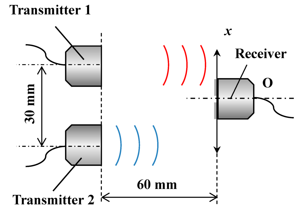 where x is the relative lateral displacement of the receiver from its origin, f(x) represents the standardized ultrasound intensity of the received ultrasound, σ is the standard deviation of the data plots, and μ is the position of the transmitter. In the following section, we will describe the measurement method for lateral displacement utilizing the characteristics of the air-coupled ultrasound transducer.