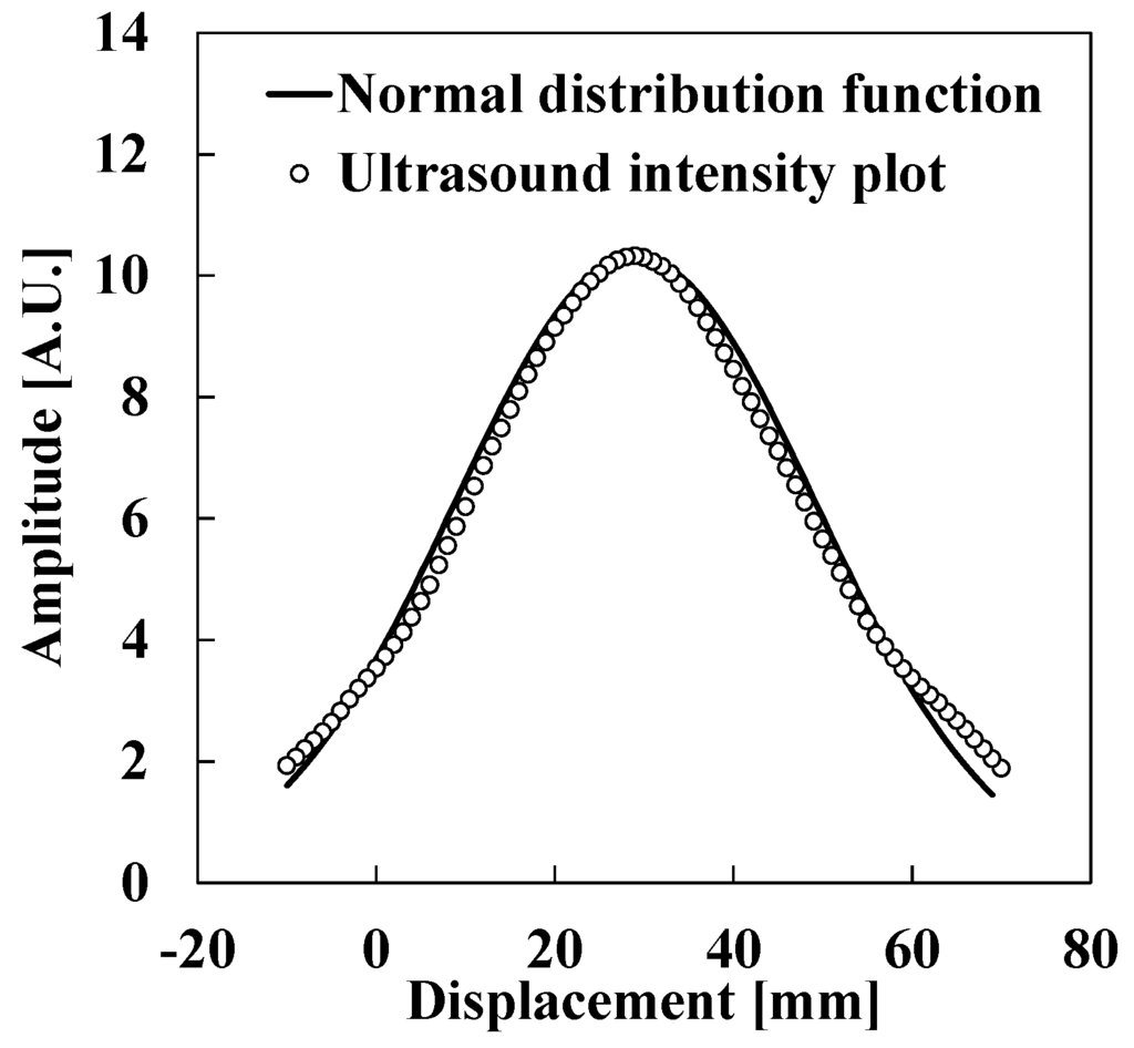 Figure 5 shows the ultrasound intensity distribution of the air-coupled ultrasound transducer by conducting the experiment shown in Figure 2. In Figure 5, open circles show the ultrasound intensity as measured by the receiver in each position. The solid line shows the fitted Gaussian curve. It is clear that these plots can be approximated by the Gaussian curve fairly well. The fitted curve is expressed using the following normal distribution function: