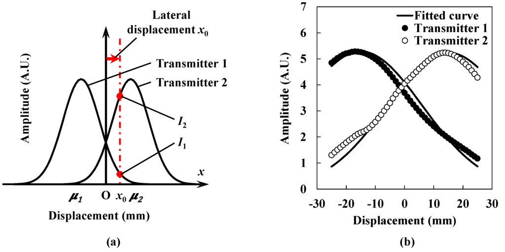 Equation (5) indicates that the lateral displacement x0 is expressed as a logarithm of the ratio of I1 to I2, which are obtained from the two transmitters. If the calibration for the displacement measurement is carried out, we can obtain the values of A and B as known constants beforehand in Equations (6) and (7). Even if the shapes of the data curves obtained from transmitters 1 and 2 are not identical to each other, the difference in the standard deviations and their absolute values are included by the constants A and B as long as the Gaussian fitting is applied to I1 and I2. Therefore, the lateral displacement x0 is successfully derived by measuring the logarithm of the ratio of I1 to I2. If a wider range of lateral displacement measurement is required, the arrangement of continuous pairs of ultrasound transducers will make it possible. Figure 6b shows the actual data plots representing the ultrasound intensity distributions according to the position of the receiver. The open circles and closed circles show the ultrasound intensities obtained from transmitters 1 and 2, respectively. The solid line shows the fitted curve that is explained after the following procedure.
