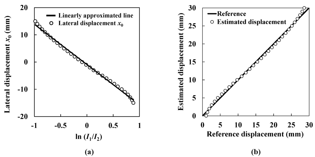Figure 7a shows the data plots of lateral displacement according to the logarithm of the ratio of the ultrasound intensities obtained from the two transmitters. The solid line shows a linearly approximated line that is expressed as follows: