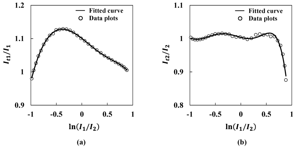 where It1 and It2 are normally approximated values that are described on the fitted curve as shown in Figure 6b, e1 and e2 are compensation coefficients for the obtained ultrasound intensities I1 and I2, respectively. Compensation coefficients are expressed as functions of the logarithm of the ratio of I1 to I2 in Equations (9) and (10). Figure 8 shows the values of It1/I1 and It2/I2 by changing the logarithm of the ratio of I1 to I2 to derive the compensation coefficients e1 and e2. For these coefficients, polynomial approximation is applied because the values of It1/I1 and It2/I2 fluctuate greatly as shown in Figure 8. The compensation coefficients are represented as follows: