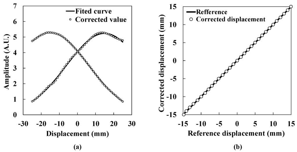 where y shows the logarithm of the ratio of I1 to I2. As shown in Figure 8 and Equations (11) and (12), the compensation coefficients were successfully obtained. Figure 9a shows the corrected ultrasound intensity distribution with the application of Equations (11) and (12). Open circles show corrected values. The solid line shows the fitted curve previously shown in Figure 6b. The fitted curve and the corrected values overlap fairly well. Figure 9b shows the corrected lateral displacement. Open circles show the corrected lateral displacement. The solid line shows the reference displacement. From the Figures, it is clear that the corrected lateral displacement agrees well with the reference. The fluctuation between corrected values and the reference is within 0.20 mm at maximum. Because the fluctuation rate for the 30 mm range corresponds to 0.67%, it is verified that this system has sufficient accuracy for a small displacement region. For the actual measurement activity, a manual stage needs to be arranged under the transmitters or the receiver for the system calibration. After the calibration, the stage should be fixed as a base keeping its position at the origin.