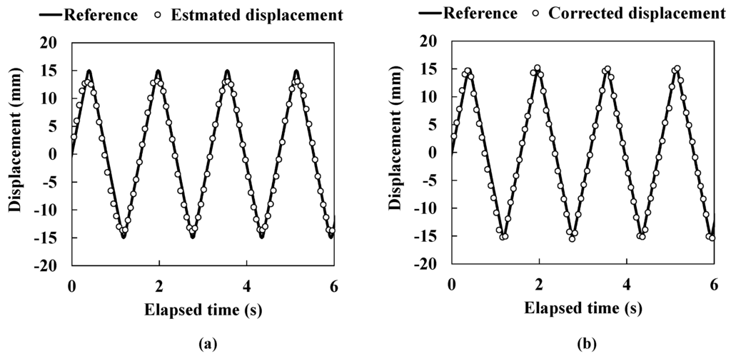 Figure 10 shows the results of the dynamic response experiment. The solid line shows the reference displacement and the open circles show the estimated displacement in Figure 10a as well as the corrected displacement in Figure 10b. In both Figure 10a,b, a good capability for the dynamic response can be seen. By using the correction method, as expected, better accuracy was achieved compared to methods utilizing only Gaussian distributions as shown in Figure 10a,b. Generally, a building shakes with high frequency over a small displacement region compared rather than a large displacement region. Therefore, our sensor system required a high responsiveness performance appropriate for small displacement regions. However, the sensor application in this paper is applied to a seismically isolated building that is shaken with several Hz at most. Additionally, the ultrasound propagates at around 340 m/s, which is much faster than the movement of the seismically isolated layer. Because the distance between transducers is set to be very close in the sensor application, it is considered that this sensor follows the seismic motion well over both small and large displacement regions.
