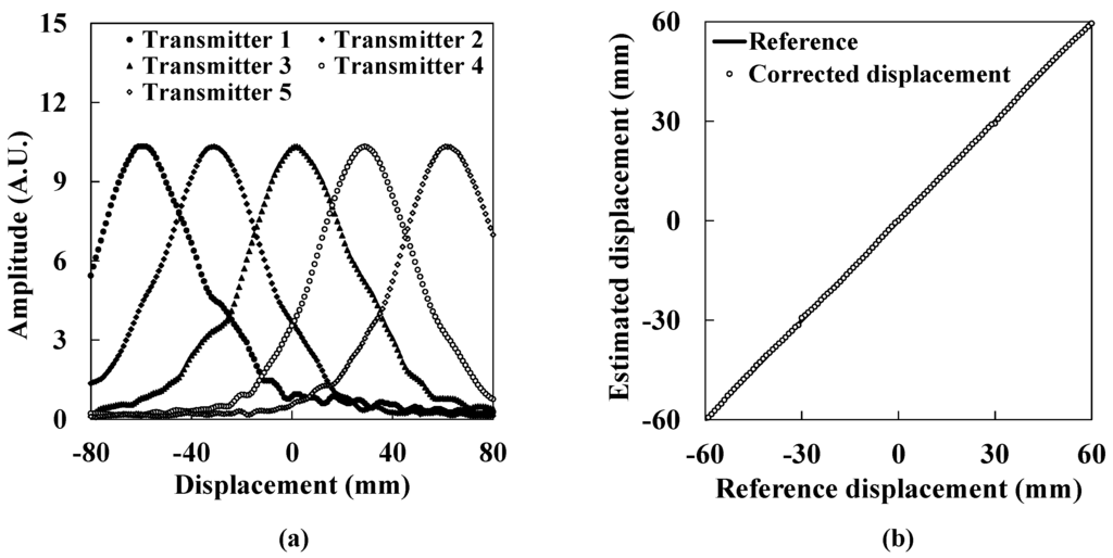 Measuring lateral displacement over a wide range. (a) The ultrasound intensity distribution obtained from five transmitters; (b) The corrected lateral displacement.