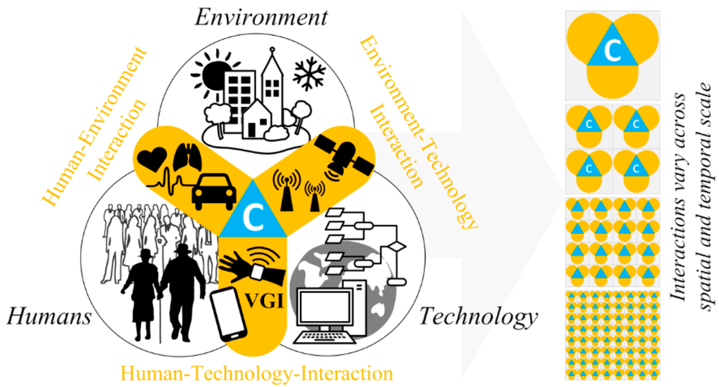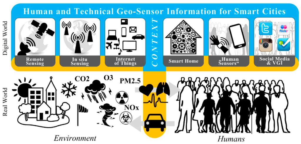 As discussed in Section 1.2, human-environment interactions cannot be sensed directly using technical or human sensors; an interaction with technology is required in order to obtain a digital representation of the particular environmental or social phenomena of interest in order to explore these human-environmental interactions. Furthermore, as discussed in the Introduction, context is multifaceted and varies across both spatial and temporal scales. The overall challenge of integrating contextual information into geospatial analysis for smart cities thus involves both technical and methodological components.
