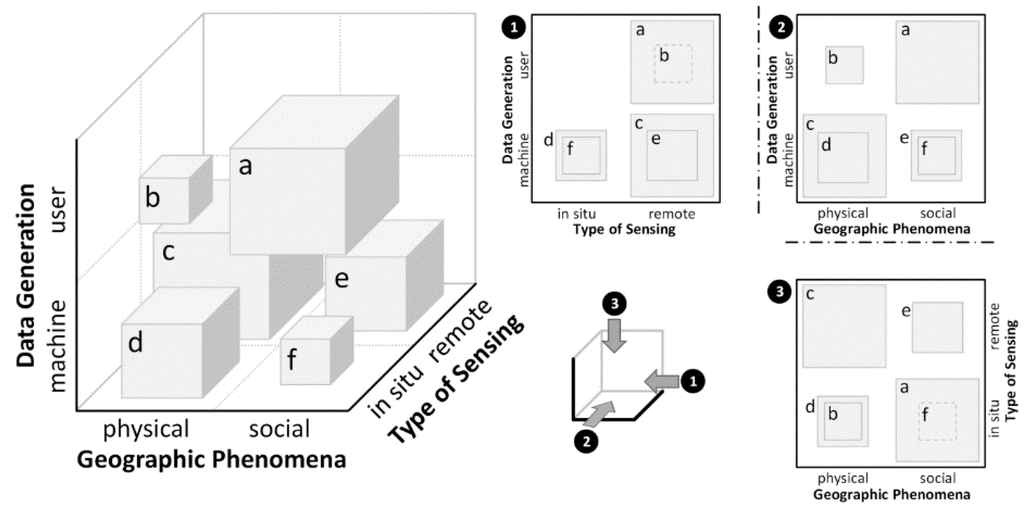 Dimensions involved in sensing (data generation, geographic phenomena, type of sensing), and some exemplary blocks (a–f) representing the amount of sensor data assigned to each dimension []. (a) VGI and mobile network traffic: associated with in situ sensing, social phenomena, and user-generated data; (b) VGI in the context of environmental status updates: associated with in situ sensing, physical phenomena, and user-generated data; (c) Satellite imagery: associated with remote sensing, physical phenomena, and machine-generated data; (d) Measurements from sensors and sensor networks: associated with in situ sensing, physical phenomena, and machine-generated data; (e) Human settlements extracted from satellite imagery: associated with remote sensing, social phenomena, and machine-generated data; (f) Numerical data at entrances to, and exits from shopping malls, public transport, etc.: associated with in situ sensing, social phenomena (e.g., mobility), and machine-generated data.