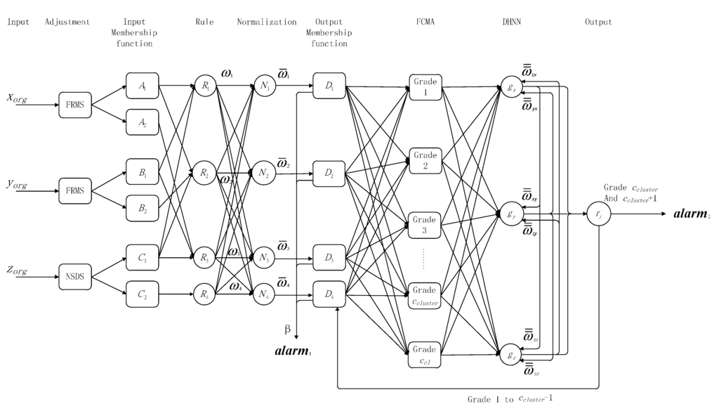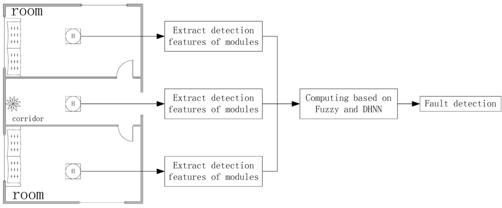 The existing published research offers few effective methods to solve the above problems, and the schemes are explained in the related work section. In this paper, first the characteristics of the samples are extracted and attention is paid to ANN knowledge acquisition with fuzzy inference. Then, a kind of Adaptive Fuzzy Discrete Hopfield Neural Network (AF-DHNN) method is designed. First, the original detected data are obtained with two features. Secondly, expression of module states with membership functions, data detection of each module, initial determination of the states of nodes and modules, and part of the early fault diagnosis process are actualized by fuzzy inference. Thirdly, the multi-dimensional central points are found by c-means clustering, sorting and classification, and an adaptive clustering rating system is established. Fourthly, according to the above rating system, the value set after fuzzy inference is two-value processed to obtain real node and module states with the characteristics of a single layer discrete Hopfield neural network. Finally, the performance of AF-DHNN is verified in a high-rise building fire model.