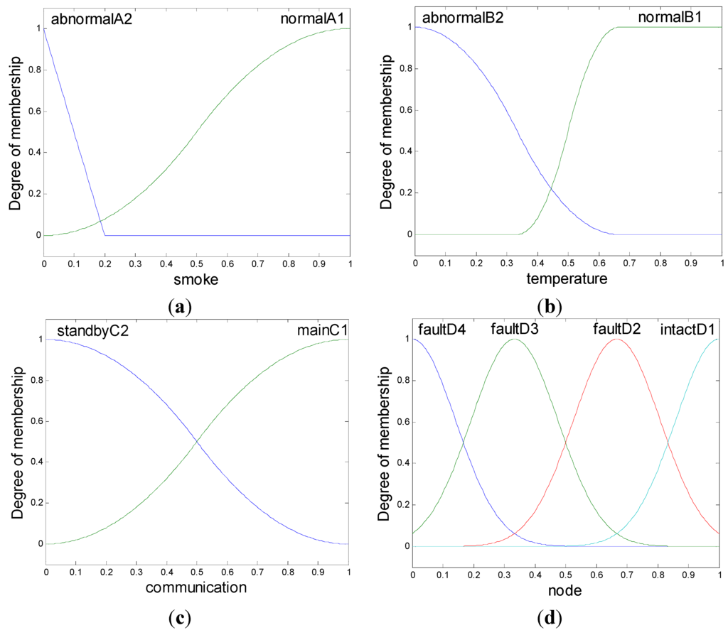 After the basic fuzzy inference design, the regulations of single items and the rules need to be established. The membership functions used in the scheme are shown in Figure 3. Because smoke spreads easier, faster, and is more dangerous than heating, the membership detected smoke function is more sensitive, and the abnormal status is detected more simply. Also, its abnormal range is more narrow and can be kept separate from cigarette and cooking fire effects. In contrast, the membership function of communication, which detects modules, is divided between identical function and structure.