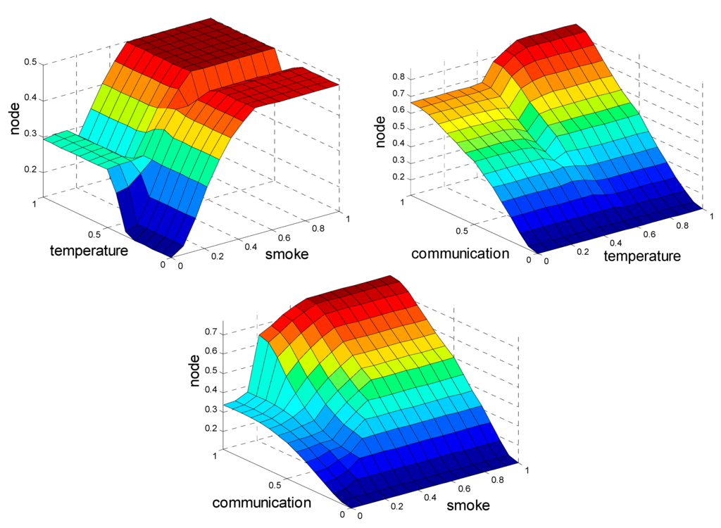 In addition, the membership function of the node status is divided according to criticality. The distribution of items from safe to dangerous are intact, temperature detector module faults, smoke faults, and main communication faults. Hence, as shown in Figure 4, the fuzzy rules are settled with the distribution items. The fuzzy rules are: