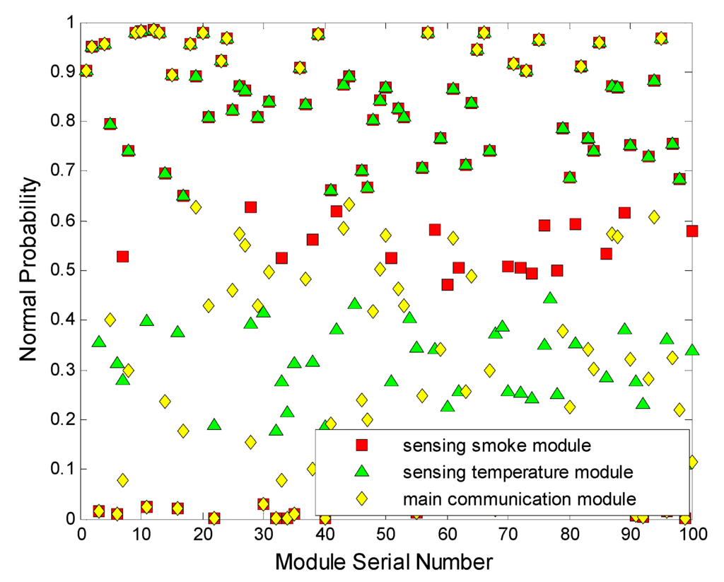 The structure of nodes based on the WSN distributed computation should be concise to establish a standard (Mamdani) model for analyzing the state of a single node. Unified sensor nodes are used in this paper. Each one is composed of a smoke detector, a temperature detector, a main communication module, and a standby communication module. Multi-input and single-output are utilized to simplify the subsequent analysis. As shown in Equations (4) and (5), the variables are normal probability sets including flue gas dimming extent x, ambient temperature y, communication module z, and output node status s in time T. The input discourses are U, V, and W. The output discourse is :