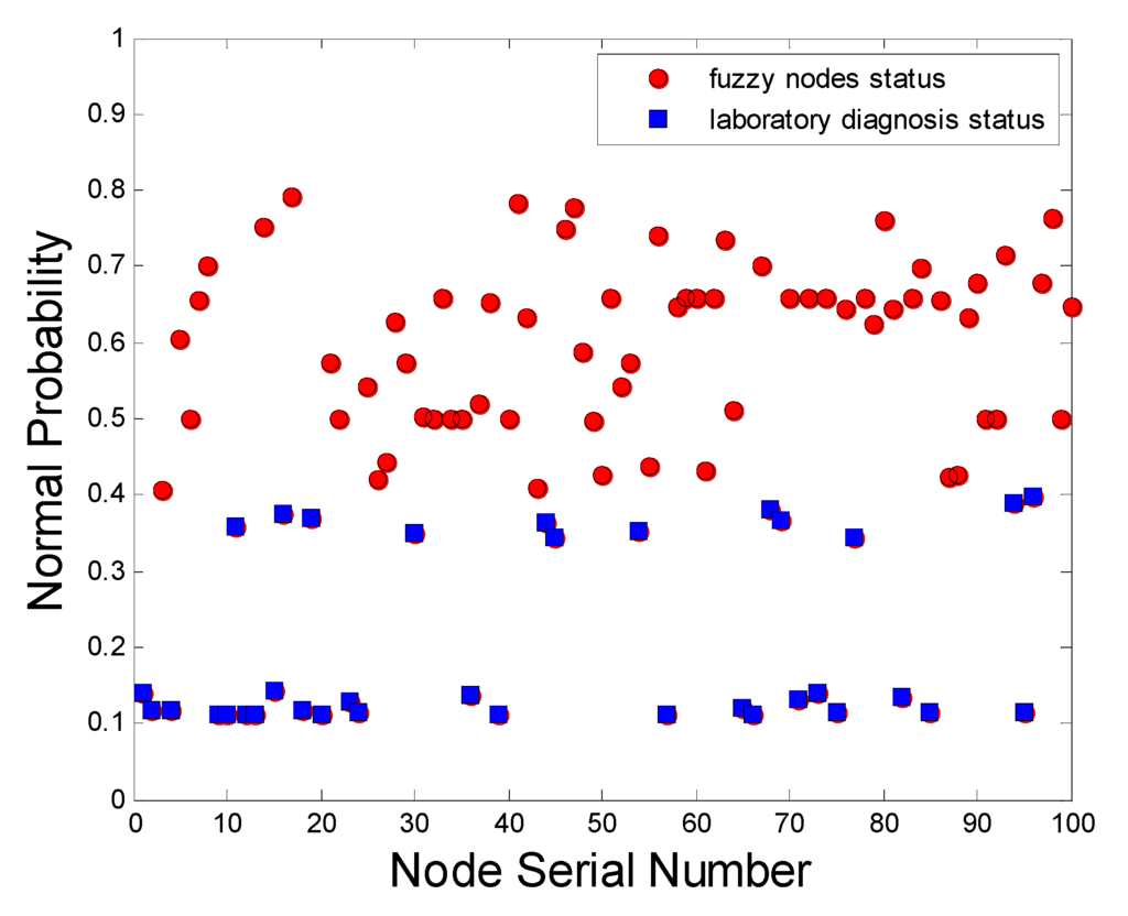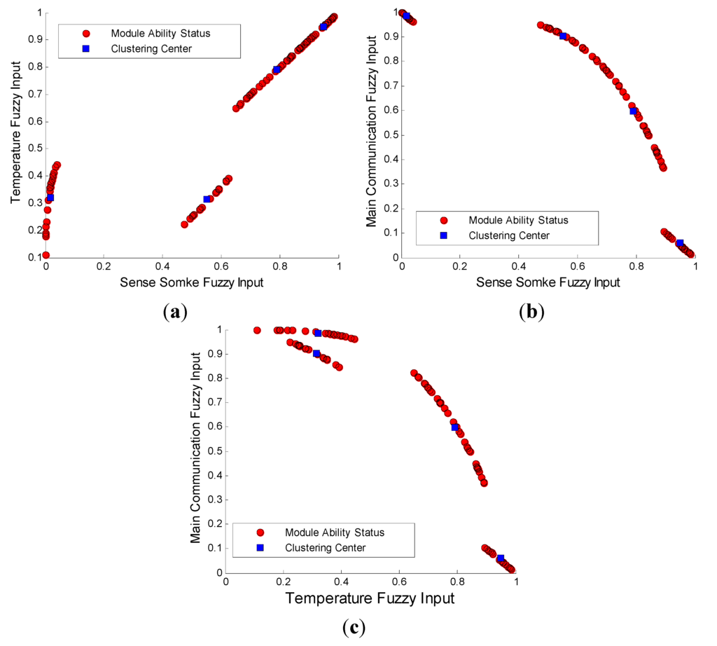 After samples are collected, the original data are subjected to fuzzy inference processing with a fuzzy controller [29,30]. Fuzzy set theory, expert systems, and control theory are used for obtaining the fuzzy solutions of problems with complex processes and indirect modeling and also to initially diagnose each WSN node’s status.