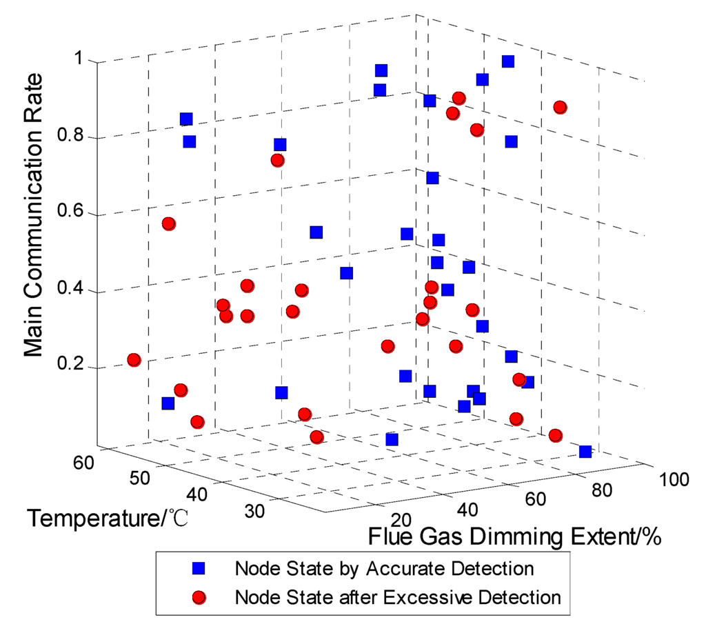 It is easy to understand that not each node expresses a wide gap, because some nodes have few faults. They have been included in the higher grades to the faults. In contrast, according to Figure 13, the 16th node with visible faults on the second floor can be selected to reveal how much the performance gap between the above three kinds of method is. Consequently, the true environmental parameters and the detected data, which are the combination of 1000 experiments, are shown in Figure 17. Then, it can be seen that the two modules with different functions have faults and particular characteristics, in which the gap between true and faulty nodes becomes larger and larger. They are both separated into initial, fast developing, and violent stages. One of them is the flue gas dimming extent change, at which the violent stage lasts longer than the other two. The other is the ambient temperature change, at which the development stage is the longest of all. Indeed, the next analyses about the detection at each stage can be expressed clearly. In addition, the communicaion status here is like in a normal enviroment, so it need not to be introduced again.