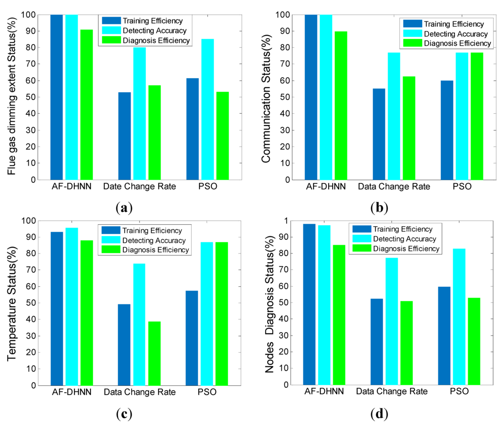 The diagnosis performance comparison in normal environment. (a) flue gas dimming extent status; (b) communication status; (c) temperature status; (d) nodes diagnosis status.
