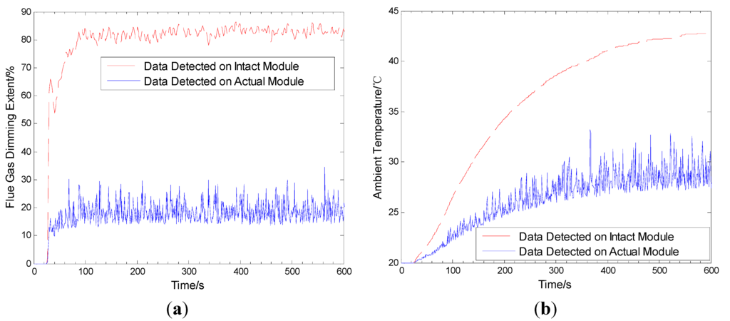 The real and detected average environmental parameters in fire. (a) flue gas dimming extent change; (b) ambient temperature change.