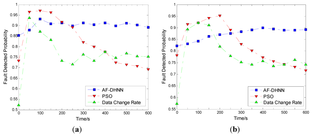 Secondly, it is about stability [52,53]. It is obvious that the AF-DHNN method is smoother than the other two. After computation, the fault variance detected probability of AF-DHNN is 0.0004; of the data change rate method it is 0.0091; and for the PSO method it is 0.0115. Furthermore, the AF-DHNN is steady, because the fuzzy controller is so inclusive that the membership functions can be set up to deal with a massive situation in advance, but with little effect on detection. In contrast, the data change rate and the PSO method focus on the transformations, but are insufficient to work in a smooth environment like the initial and violent stages effectively. Besides, the former focuses on time change, and the later focuses on the globe change at single time points. Hence, the AF-DHNN is also more effective.